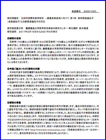 東京百寿者研究、全国超百寿者研究の研究参加者の皆様へのお知らせ 研究参加者 2017/06/05 このたび、慶應義塾大学医学部百寿総合研究センターでは、理化学研究所と百寿者、超百寿者、スーパーセンチナリアンの方の血液中のRNA全体、および1細胞ごとのRNA解析を行い、老化に伴い増減する分子マーカーや、健康長寿者に特異的に存在するRNA分子の解析を行います。詳しくは添付の文書をご覧いただき、参加を希望されない場合にはその旨をお申し出ください。 ※画像をクリックすると文書をご覧いただけます。 次へ